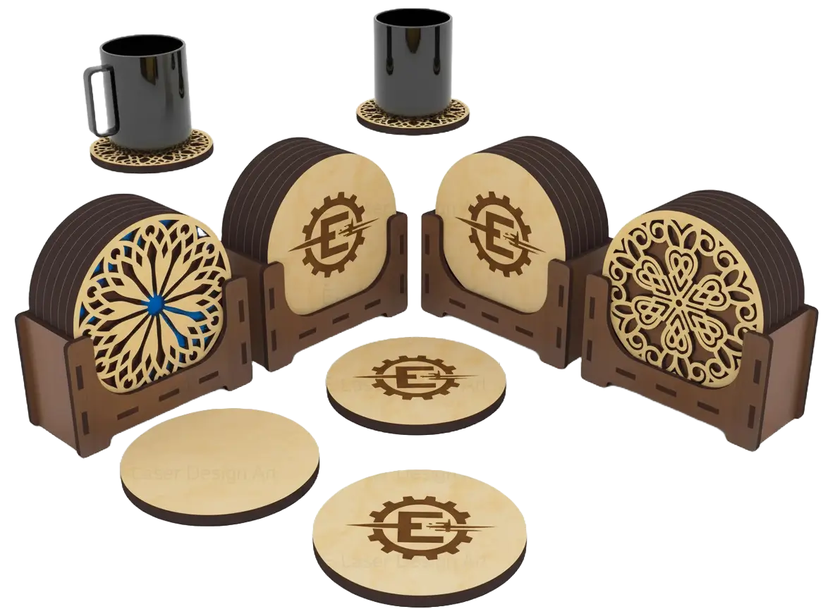 Premium laser-cut and engraved MDF coasters featuring customized corporate branding, perfect for professional gifting and office use.