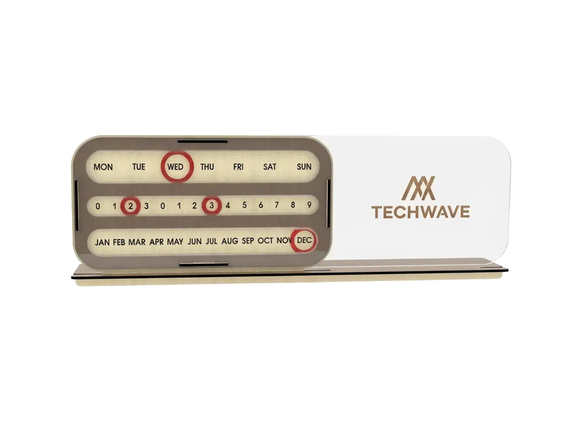 Enhance your office space and brand presence with our Wall Hanging Desktop Perpetual Calendar, crafted from premium MDF and acrylic for a sleek, professional look. This elegant corporate accessory combines a perpetual calendar mechanism that allows manual adjustment of day, date, and month with a stylish space to feature your company logo, making it a functional yet personalized décor piece.