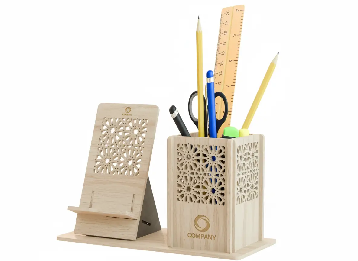 This laser-cut MDF Pen Holder with Mobile Stand is a smart, space-saving desk accessory crafted to enhance organization and convenience in any professional workspace. Made with precision laser-cutting technology, it features smooth edges, clean detailing, and a sturdy MDF build that ensures durability. The integrated mobile stand provides a stable slot for smartphones, making it perfect for video calls, quick viewing, or charging access—all while keeping essential writing tools neatly arranged.
