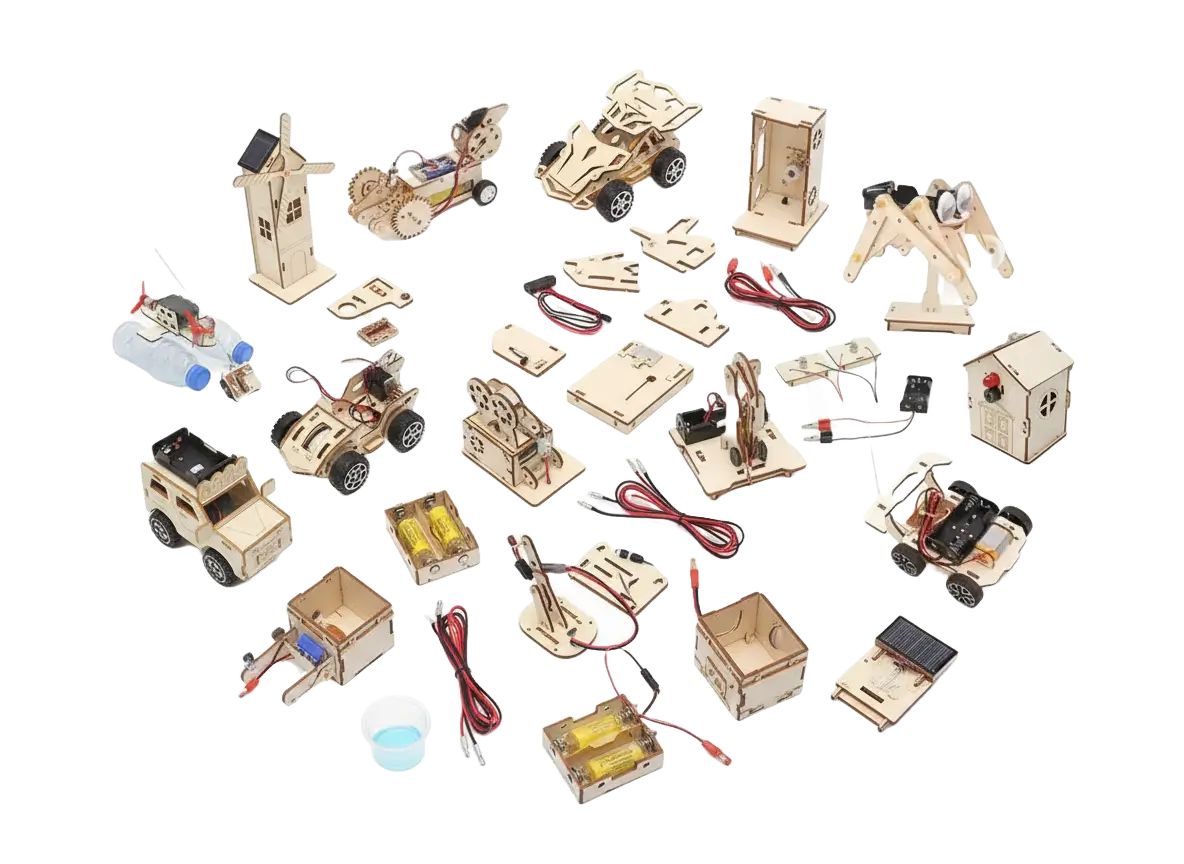 A complete MDF STEM kit packed with batteries, motors, LEDs, actuators, sensors, and wires for fun, hands-on electronics and engineering projects.